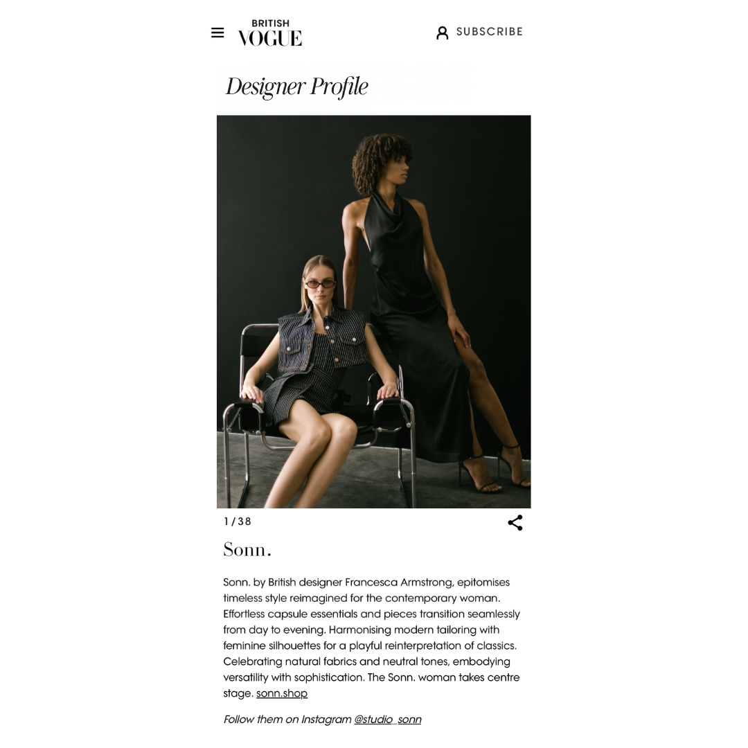 Sonn. founded by British Designer Francesca Armstrong creates effortless and timeless pieces for both Men and Women.
